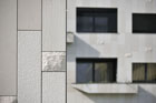 clad in white stone of various textures. The building's footprint